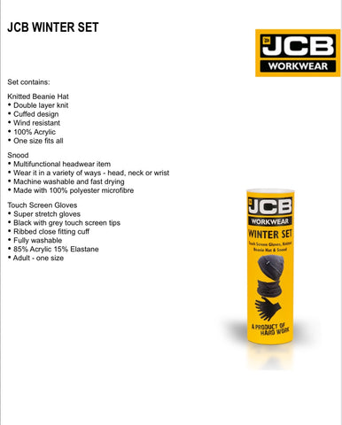 JCB Brand Beanie hat work gloves and snood in an attractive presentation pack. An ideal stocking filler.